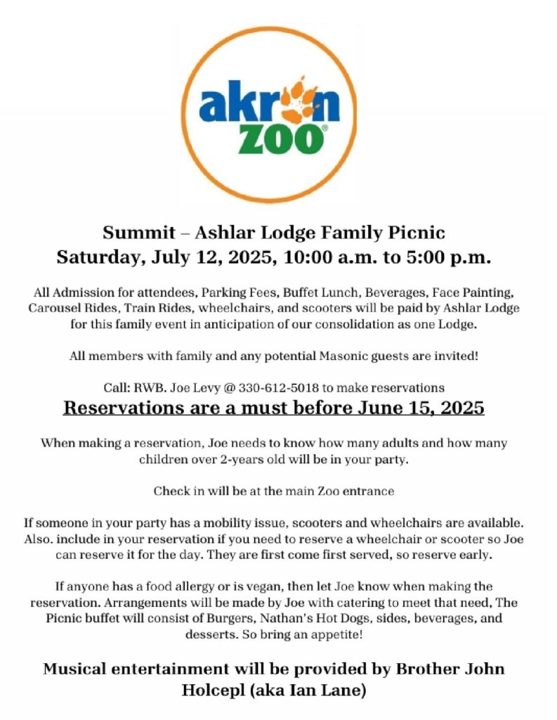July 12, 2025 – Akron Zoo Event – Open to all families. Bring the kids to the zoo. See flyer below. Some added information to the flyer, when making reservations, please inform RWB Joe if you intend on getting faces painted, riding the carousel, or doing the train ride so he can get a count for the zoo. Also, if you are handicapped and you have a wheelchair or scooter, please bring it. The zoo does have them but like anything else, you can’t count on it working properly.
