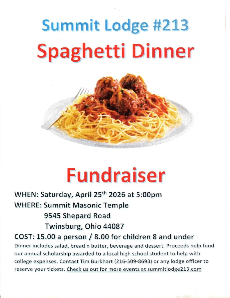 April 25, 2026 – 5:00 pm – Annual Fundraiser – SPAGHETTI DINNER – See flyer below – We will have a guest speaker. RWB Russell Herner. He will do a great presentation on the European Cathedrals and how they tie in with the Masons. He will have his book for sale which will cost $40.00. This book will be a great addition to anyone’s bookshelf. He does a great job.